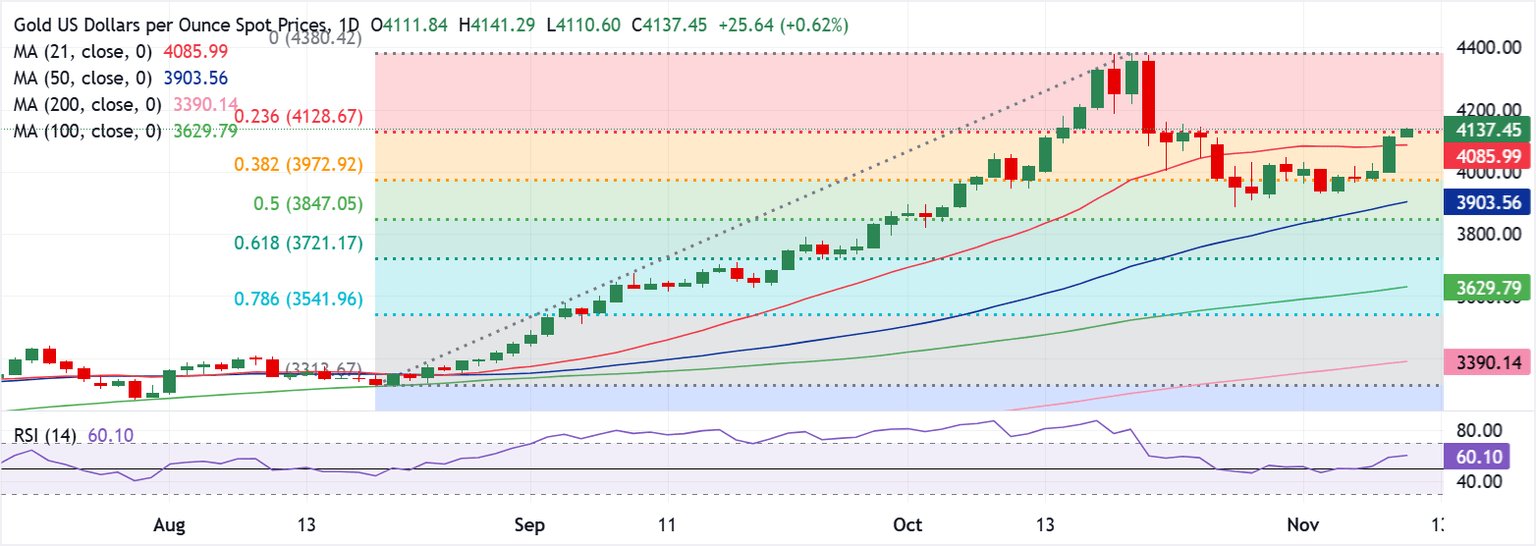 Gold is flirting with the $4,150 barrier early Tuesday, sitting at the highest level in three months. The focus now turns to the US ADP weekly jobs report amid a potential end to the government shutdown.