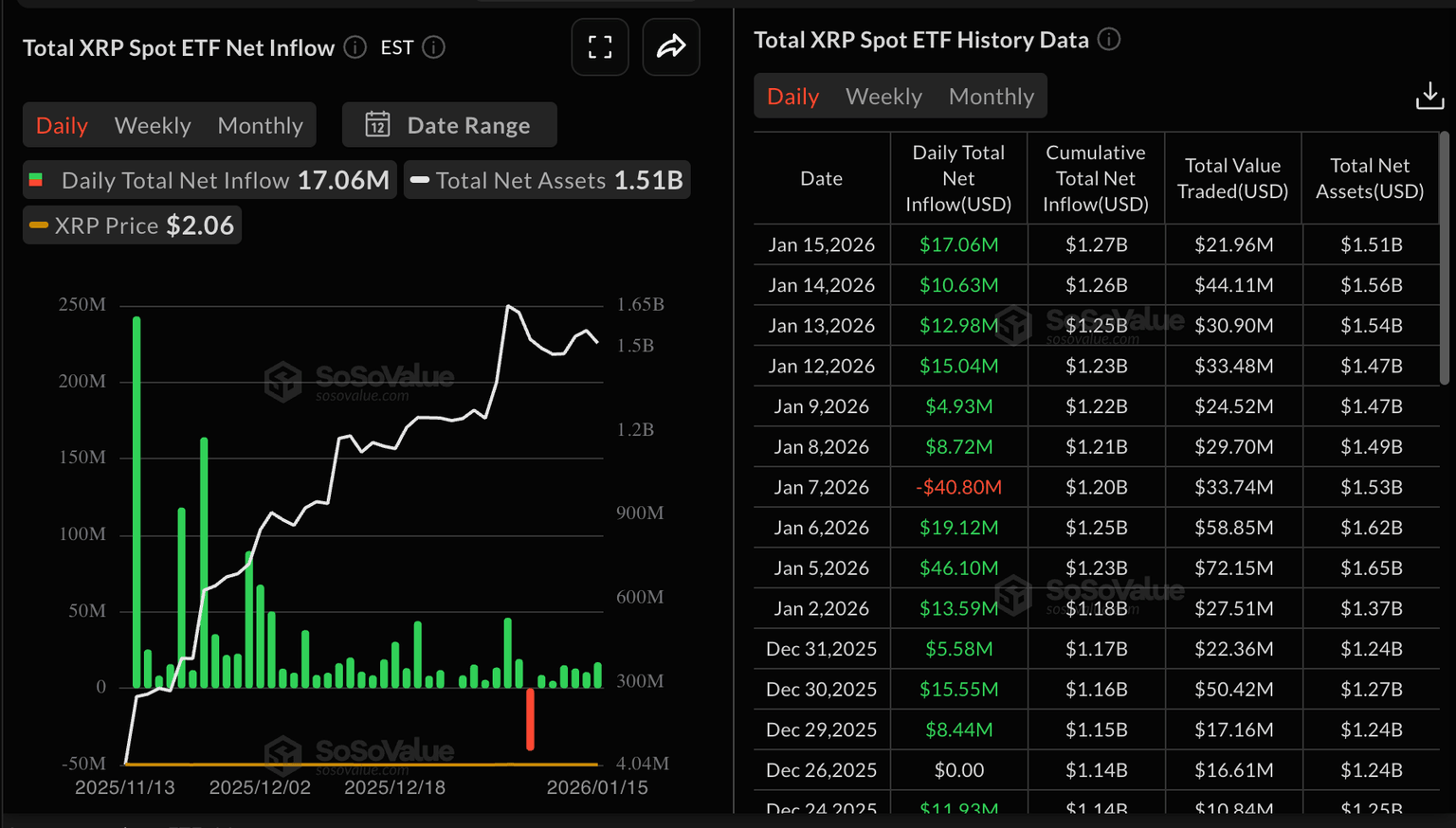 US-listed XRP ETFs recorded approximately almost $17 million in inflows on Thursday, up from almost $11 million on Wednesday, according to SoSoValue data. The cumulative inflow stands at $1.27 billion, and the net assets at $1.51 billion, indicating steady investor confidence.
