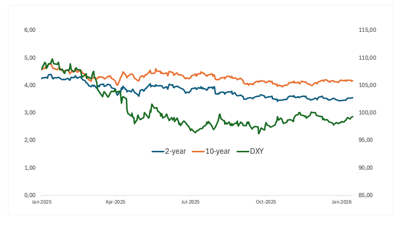 - US economic data showed a mixed inflation picture, with consumer prices stabilizing while producer prices turned hot. On an annual basis, headline CPI held at 2.7% in December, virtually unchanged from November, whereas PPI accelerated to 3%, up from 2.8% the prior month, highlighting lingering cost pressures upstream.